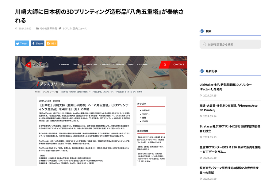これは私が大学卒業まで川崎に住んでいて、よく行って見ていた川崎大師の八角五重塔が3Dプリンティングで模型になったんだという個人的な懐かしさもありますが、製造における研究開発支援の会社が企画とデータ作成、樹脂3Dプリンターメーカーが製造をしたという、異なる専門企業がそれぞれの得意分野で協働した点で注目しました。なかなか日本ではこのような協働ができにくいと聞くことがありますが、このように企画・アイデア・デザインがAM活用拡大に現状足りない部分でもあるので、もっとこのような協働が増えればと願っています。