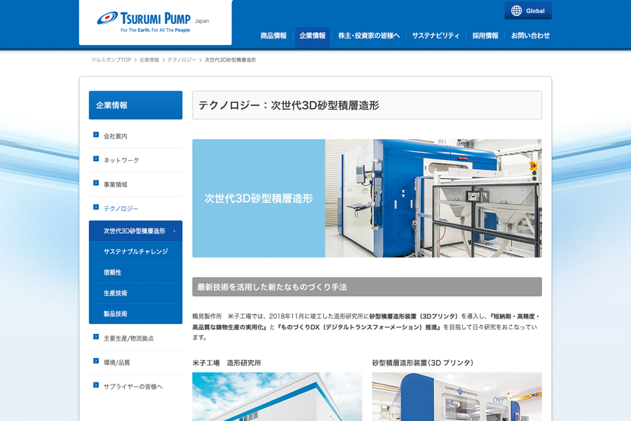 さて、5月の大型連休中は遠出をしなかったのですが、全国で真夏の暑さだった5月4日土曜日の夕方に偶然観たテレビ番組から、とても参考になるAMの活用事例を見つけました。テレビ東京系で毎週土曜日午後6時から放送されている「知られざるガリバー~エクセレントカンパニーファイル~」は日本の様々な優れた会社を紹介する番組です。特に良いと思うのは、毎回社長など企業のトップ自らが出演し、自分の言葉で企業の紹介をされることと、毎回違う女子大学生(みんな見た目キレイ系かつ、すごくちゃんと話すのにおじさんはいつも感心)がインタビューしたり企業内見学をしたりして最後に感想を話す構成で、企業の方々も難しいことを和やかに、素人にもわかりやすく説明され、「経済番組の中ではゆる系」でありながら中身は濃いところで、観るたびに「いろんな会社や技術があるなぁ」と気づかされます。その5月4日放送の企業は今年創業100年を迎える水中ポンプのトップメーカーである株式会社鶴見製作所(大阪府)で、浄水場、水田から建設土木工事現場など世界各地で壊れにくく耐久性に優れたポンプを開発製造販売されている企業でした。大変失礼ながら名前は聞いたことがあったぐらいでほぼ存じ上げない企業と製品だったのですが、番組後半で「3D砂型プリンター」の活用紹介がありました。ポンプに使われる金属部品の多くは砂型による鋳造で長年変わらない作り方で作られているそうですが、新しい生産体制への挑戦として、国産メーカーであるシーメット株式会社の砂型積層造形装置(シェアラボでも過去にこちらで開発秘話を紹介しています)を導入し、実用研究を進め、既に従来砂型製造に1~2カ月かかっていた工程を4日ほどに短縮し、品質や性能も優れた鋳造部品を製造されているとのことでした。番組を見ながら鶴見製作所のウェブサイトを見ようとしたらアクセス急増のためか開けませんでしたが、後日開けたこちらのウェブページで詳しく紹介されていました。