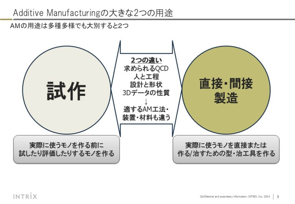 そのような二極化は、急に起きたように見える一方で、AMの歴史を振り返ってみると起こることは当然で、私はむしろ良い傾向と考えています。例を挙げると、私自身約20年前から、AMの用途について話すときに下のような図を示してきました。